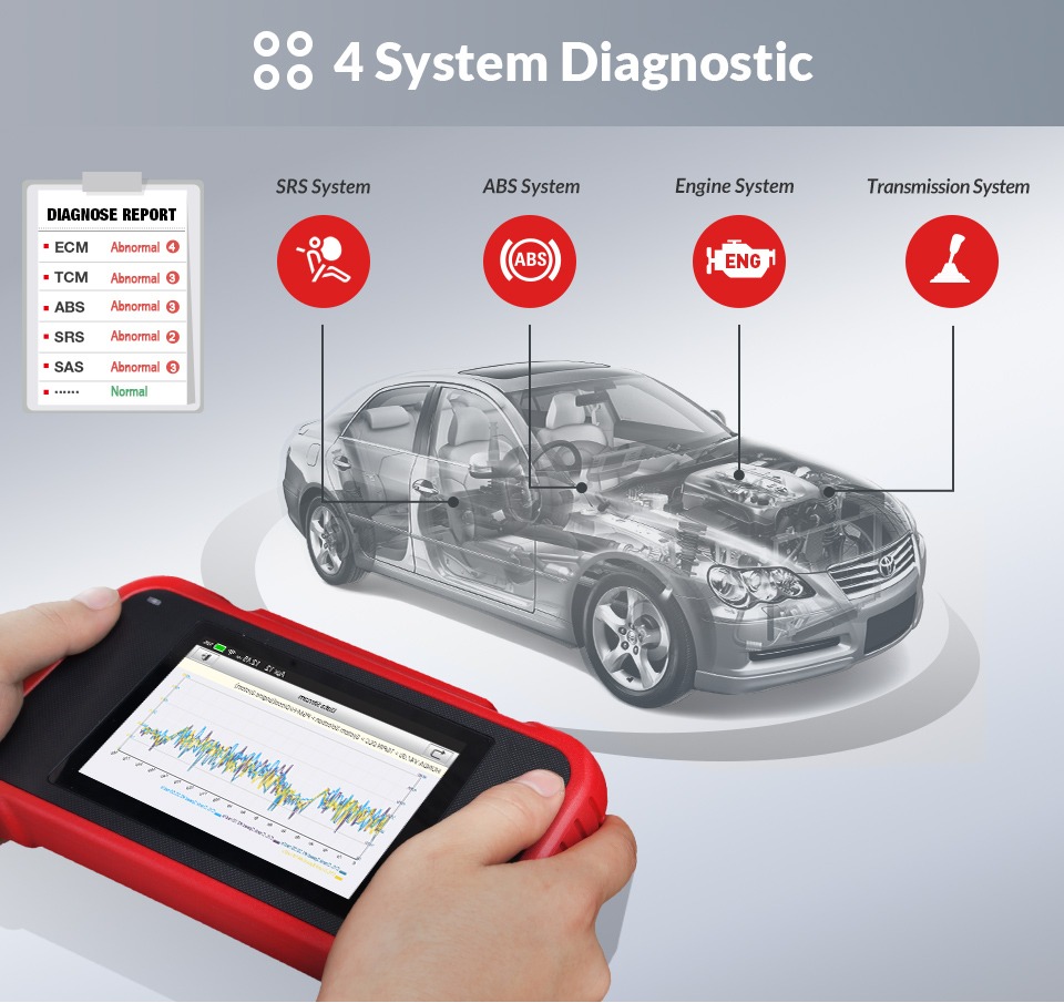 • Kompaktne OBD2 diagnostikaskanner nelja põhisüsteemi (mootor, käigukast, ABS, SRS) diagnoosimiseks.