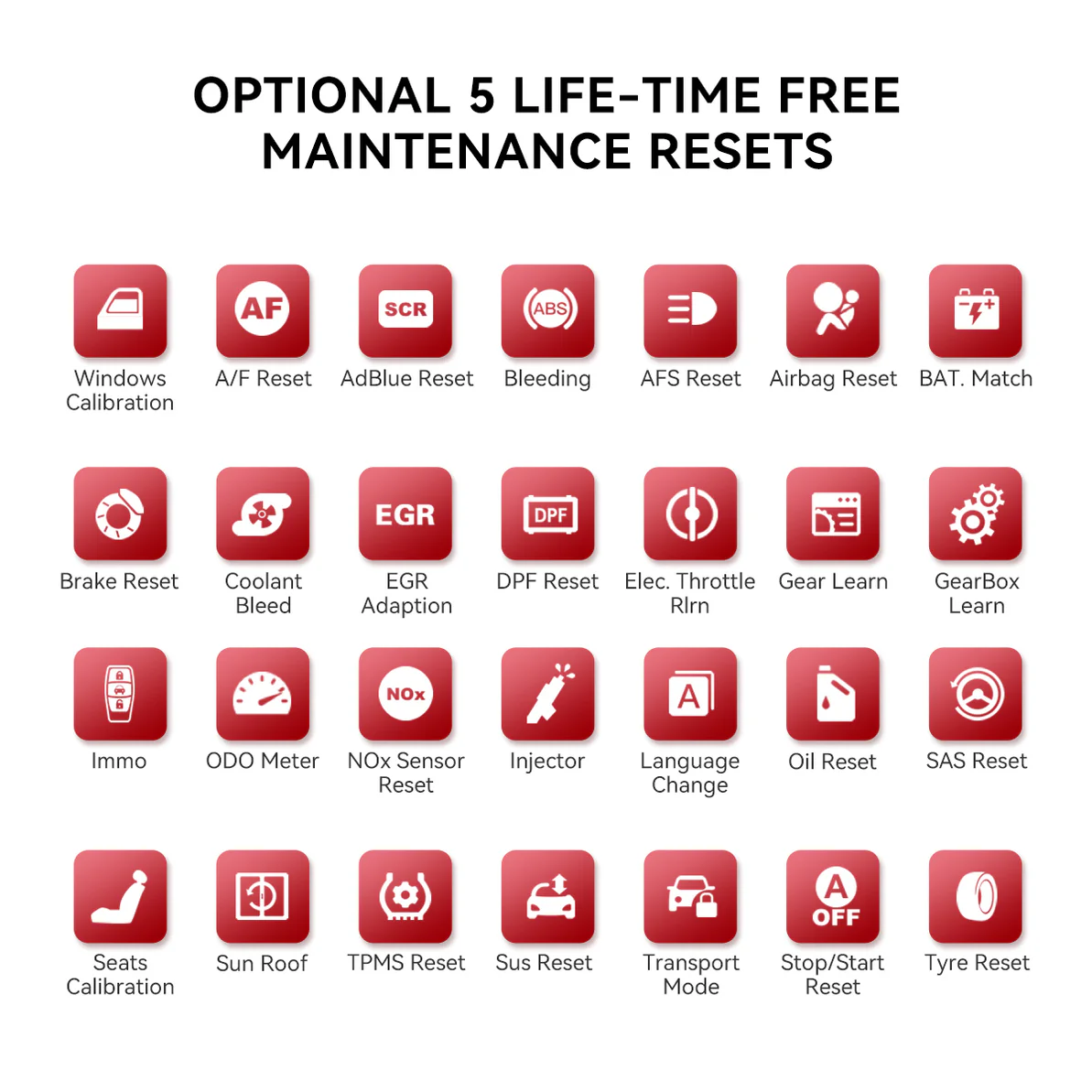 ThinkScan Plus S4 supports 5 systems (ABS/SRS/ECM/TCM/BCM) +choose 3 optional resets from 28 resets as lifetime free use and update for all cars.